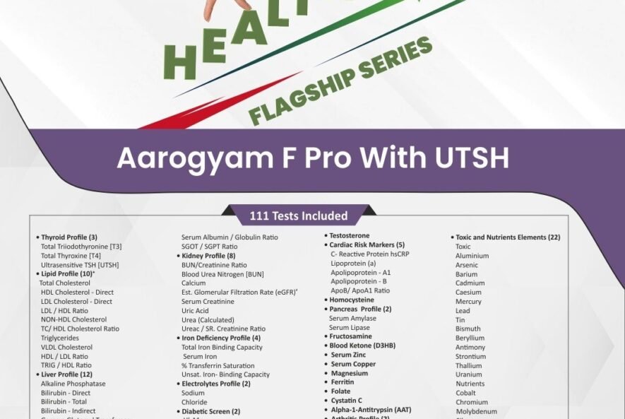 AAROGYAM F PRO WITH UTSH   Offer price :   ₹4000 BOOK NOW A total of 114 parameters make Aarogyam F Pro with UTSH a special package for preventive healthcare. Along with standard Pro series parameters, this profile contains Lp-PLA2. This helps you understand your risk of cardiovascular diseases and stroke.…