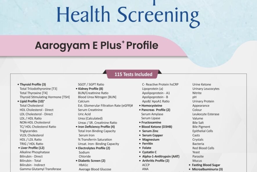 AAROGYAM E PLUS PROFILE WITH UTSH Offer price : ₹3800 BOOK NOW Aarogyam E Plus with UTSH contains 118 parameters, including the key features Complete Urine Analysis + Fasting Blood Sugar analysis. Its unique aspect is that it covers cystatin C for kidney health and antitrypsin for lung health…