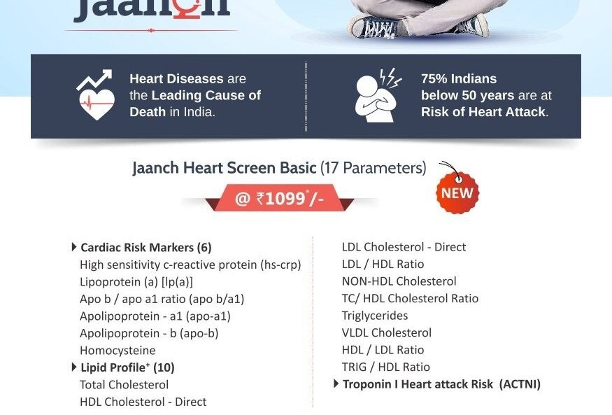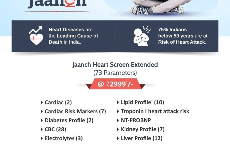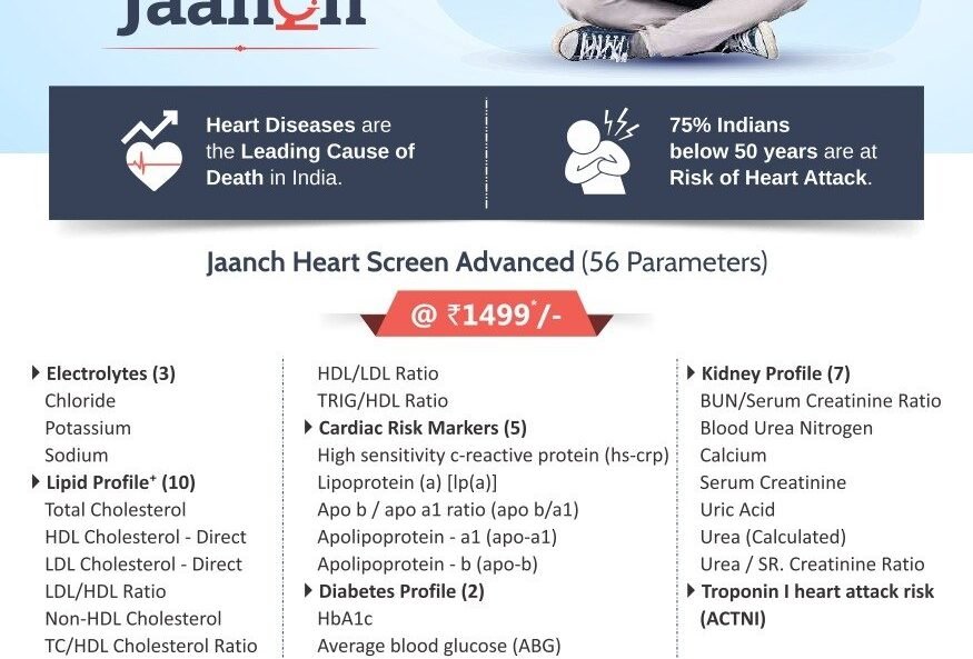 JAANCH HEART SCREEN EXTENDED Offer price : ₹2999 BOOK NOW Jaanch Heart Screen Extended package includes 73 tests, providing a detailed evaluation of your cardiovascular health. From cholesterol levels and cardiac risk markers to diabetes and kidney health parameters, this screening helps detect early warning signs and assess potential risk…