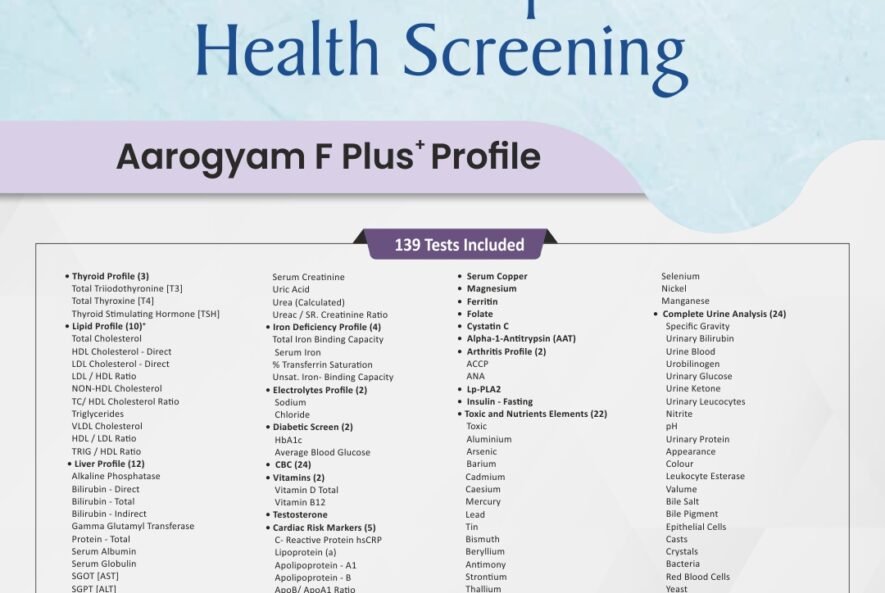 AAROGYAM F PLUS PROFILE WITH UTSH   Offer price :   ₹4000 BOOK NOW Aarogyam F Plus with UTSH contains whopping 142 parameters, including the key features Complete Urine Analysis + Fasting Blood Sugar analysis. Along with standard Plus series parameters, this profile contains Lp-PLA2. This helps you understand your risk…