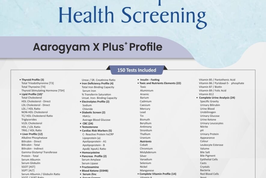 AAROGYAM X PLUS PROFILE WITH UTSH   Offer price :   ₹4500 BOOK NOW Aarogyam X Plus Profile with UTSH is a complete health checkup package of 153 parameters. Along with Complete Urine Analysis + Fasting Blood Sugar analysis, the profile offers complete vitamin analysis. The package helps evaluate Thyroid, Lipid,…