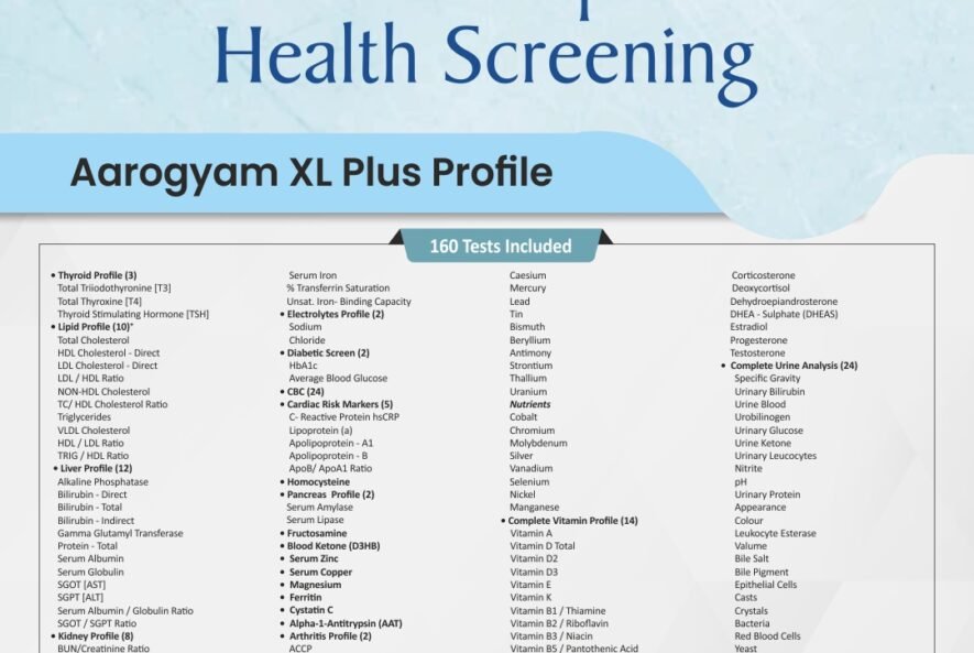AAROGYAM XL PLUS PROFILE WITH UTSH   Offer price :   ₹6500 BOOK NOW “Aarogyam XL Plus Profile with UTSH is a complete health checkup package of 163 parameters. Along with Complete Urine Analysis + Fasting Blood Sugar analysis, the profile offers steroid profile, including crucial hormones like testosterone and progesterone…