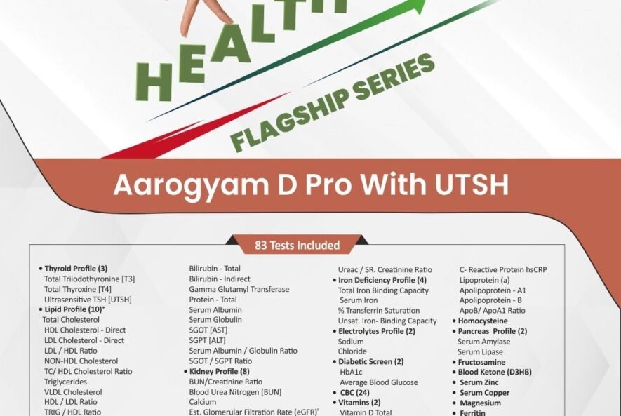 AAROGYAM D PRO WITH UTSH   Offer price :   ₹2400 BOOK NOW Aarogyam D Pro with UTSH is a unique 86-parameter package that offers full-body health checkups at affordable rates. In addition to standard parameters that cover all vital organs, it includes Cardiac Risk Markers, Homocysteine and Pancreatic profile. It…