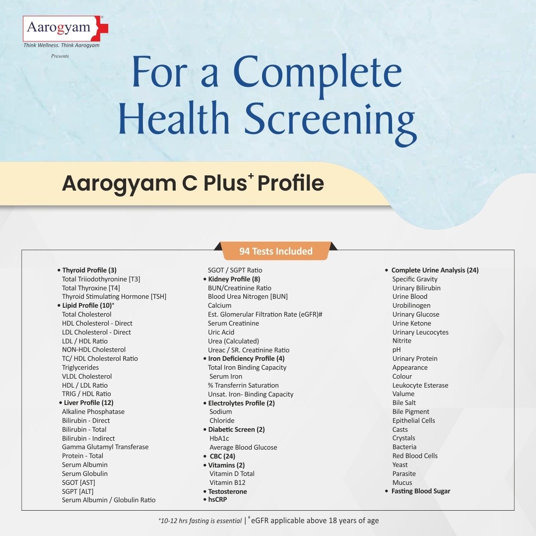 The “Aarogyam C Plus Profile with UTSH” is a comprehensive health checkup package that includes a variety of tests, including lipid, liver, thyroid, iron, diabetic, kidney, complete hemogram, hormone, and vitamin panels, along with UTSH (Urine Test and Serum Hormone).
