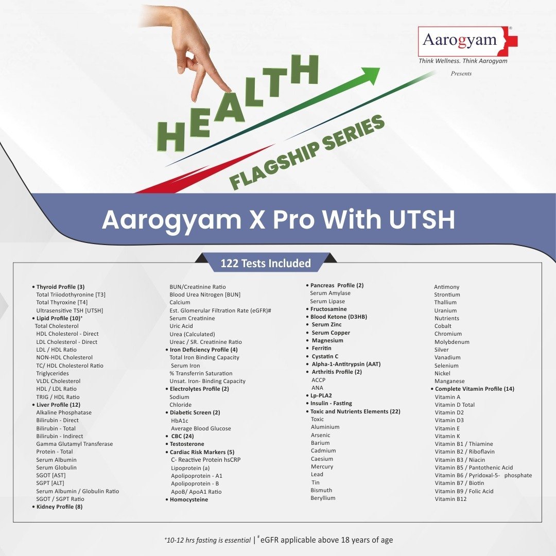 One of the biggest packages on our menu, this package contains 125 parameters, evaluates detailed along with preventive care, then Aarogyam X Pro with UTSH is the package for you with a good profit margin. Along with 122 parameters, it estimates levels of 14 vitamins (vitamin B complex and fat soluble vitamins) using highly specialized LC-MS technology. It also helps assess the health and functioning of vital organs. via CBC, diabetes screening, essential and toxic elements, and enzymes. This comprehensive package is ideal for people of all ages.