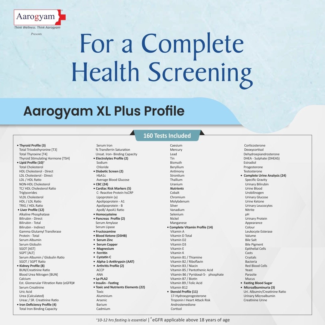 “Aarogyam XL Plus Profile with UTSH is a complete health checkup package of 163 parameters. Along with Complete Urine Analysis + Fasting Blood Sugar analysis, the profile offers steroid profile, including crucial hormones like testosterone and progesterone for men and women, respectively. This helps understand your metabolism, immune functions and sexual health. It is a value-for-money package recommended for all age groups. Regular checkups help in early detection and better management of health issues. “