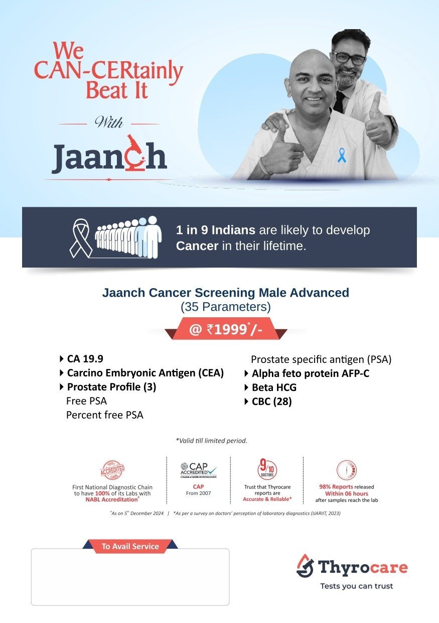 The Jaanch Cancer Screening Male Advanced package is designed to detect early signs of cancer in men. This package includes crucial cancer marker tests such as PSA (Prostate-Specific Antigen) for prostate cancer, CEA (Carcinoembryonic Antigen) for colorectal and other cancers, and CA 19-9 for gastrointestinal cancers, along with alpha feto protein AFP-C, Beta HCG and CBC. Ideal package for individuals with a family history of cancer or those seeking proactive screening, this package enables early detection and timely medical intervention.