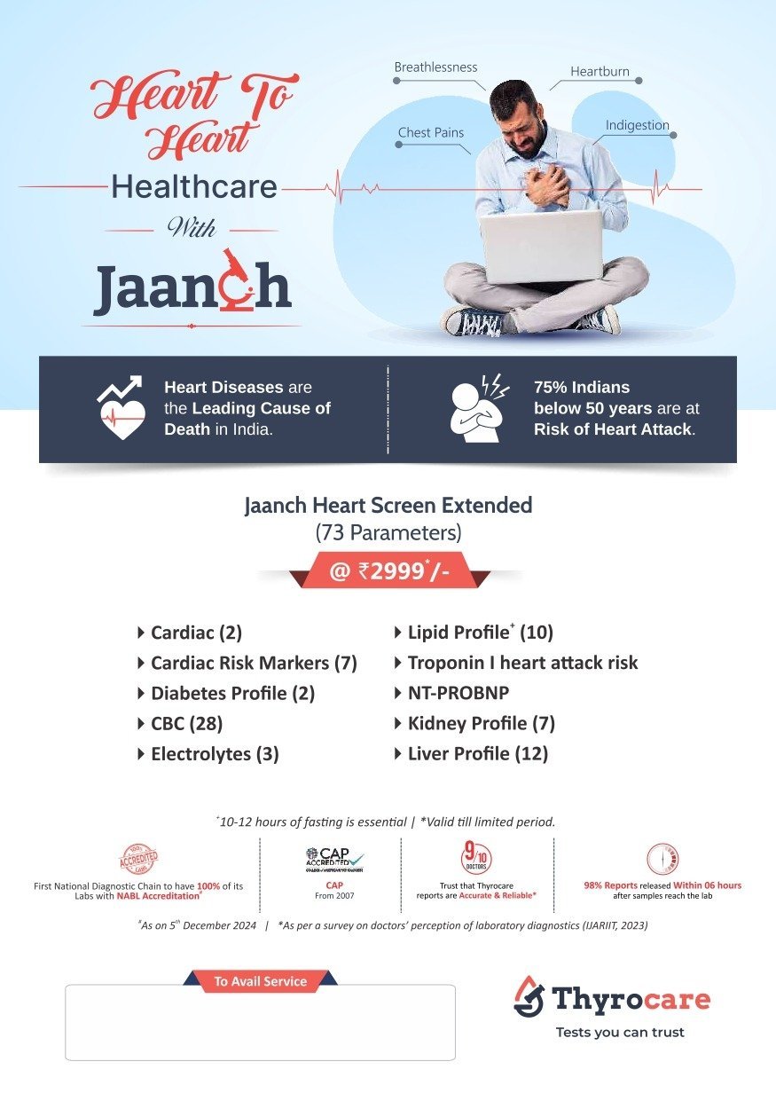 Jaanch Heart Screen Extended package includes 73 tests, providing a detailed evaluation of your cardiovascular health. From cholesterol levels and cardiac risk markers to diabetes and kidney health parameters, this screening helps detect early warning signs and assess potential risk factors. Ideal for individuals with a family history of heart disease, existing conditions like hypertension or diabetes