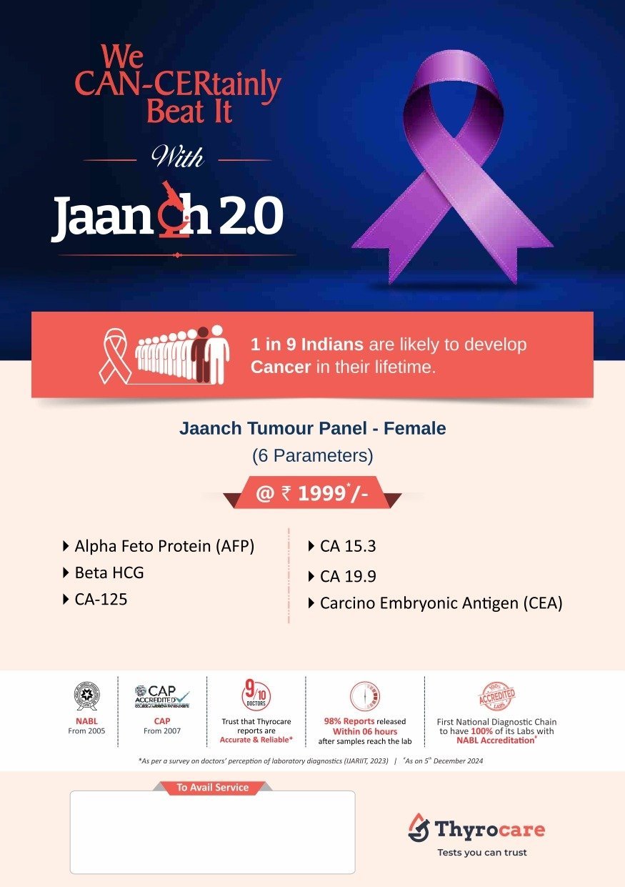 Jaanch Tumour Panel – Female is a 6-parameter health check package for women to keep a check on their health at ease. This doctor-curated package has tests for alpha fetoprotein, beta HCG, CA 125, 15.3 and 19.9, and CEA. It is a package that gives accurate results for one’s perfect health at the best price. Early detection can help one live a healthy and happy life.