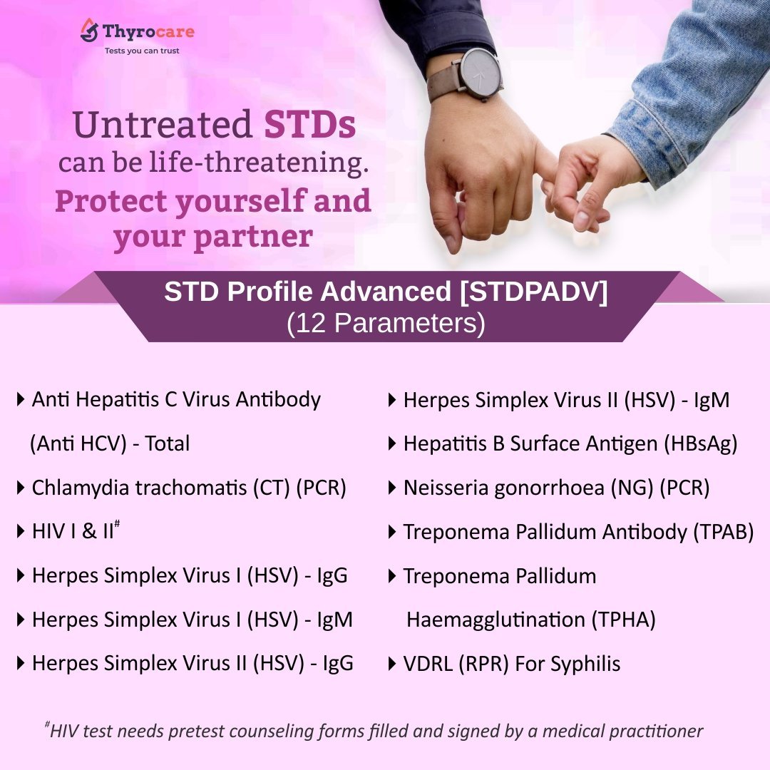 STD profile advanced includes tests for like Herpes, Hepatitis, HIV, HCV and HBV. The panel is used for screening of common sexually transmitted diseases or infections in the women by collecting blood samples or urine samples. It also tests for Chlamydia, Neisseria gonorrhoeae infections in women.