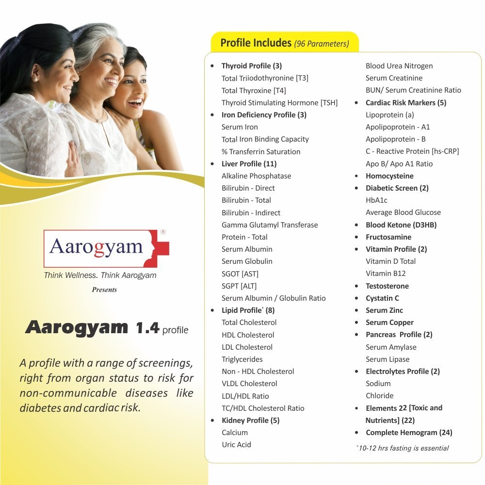 | Usage: | Aarogyam 1.4 with UTSH consists of 104 parameters that help to check one’s overall health status. Homocysteine for heart Health, blood ketone & fructosamine for diabetes management , cystatin C, zinc, copper, pancreas profile, electrolytes, nutrient and toxic elements, antitrypsin along with other crucial parameters are the key differentiators of this package making it a trule value-for-money package that offers right solution for a person’s healthcare needs. |