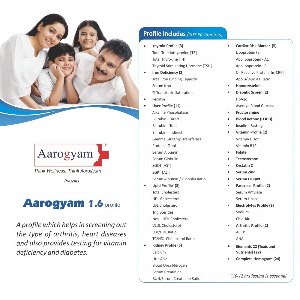 | Usage: | Aarogyam 1.6 with UTSH is a profile that consists of 109 parameters to help keep a person’s health in check. Key differentiator is the inclusion of Arthrtitis profile along with the other vital tests to check Diabetes, Heart Health, Kidney, Pancreas, Liver etc etc. A holistic health checkup package ideal for older adults |