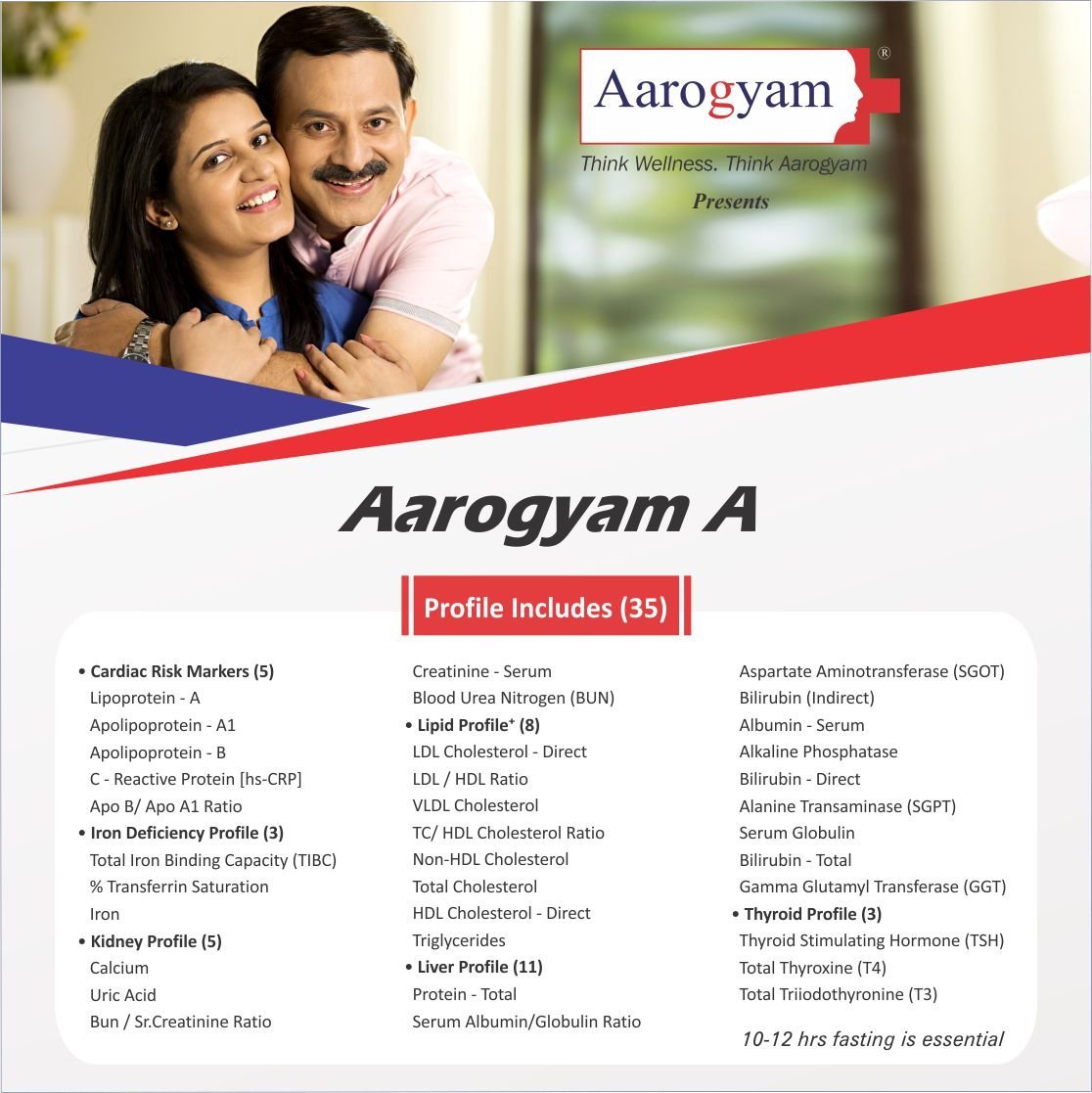 | Usage: | Aarogyam A with UTSH is a complete health checkup package of 42 parameters. The package evaluates your Thyroid, Lipid, Liver and Kidney health. Cardiac risk markers included in the package indicate your risk of heart problems, so you can plan your treatment well within advance. It is one of the most comprehensive packages recommended to all age groups and available at the most affordable rates. |