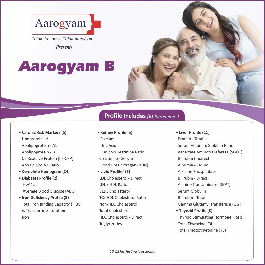 | Usage: | Aarogyam B with UTSH provides 61 parameters. It evaluates your Thyroid, Lipid, Liver and Kidney health. The key feature is Complete Blood Count + Diabetes Profile for complete health check. Diabetes can’t be treated, but you can manage it with regular health checkups. The profile also includes cardiac risk markers to indicate heart issues. It is one of the most comprehensive packages recommended to all age groups and available at the most affordable rates. |