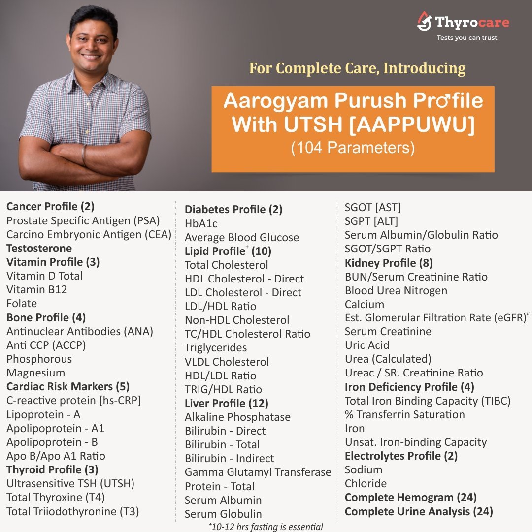 Usage: Aarogyam Purush Profile with UTSH comprises of 104 parameters tailor made for a man. It contains Hormones, Cancer Markers, Bone Profile and Complete Urine Analysis along with the all other important parameters for full body check up Curated for Sr. Citizens (Male) to monitoring important blood parameters which get affected Ideal for male above 60yrs with age.