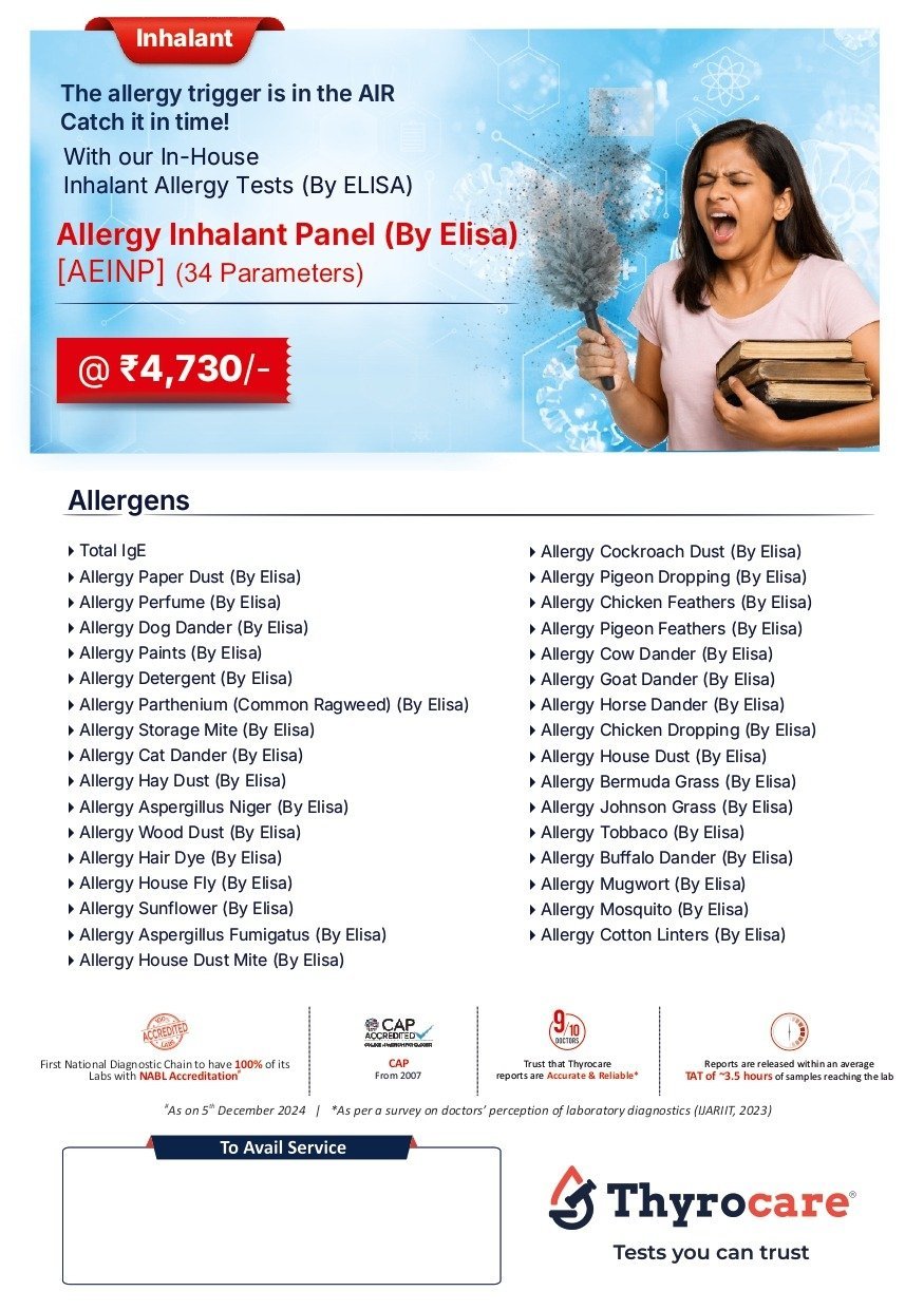 | Usage: | The Allergy Inhalant Panel (By ELISA) including 34 Tests checks whether your body is allergic to a broad range of airborne allergens by measuring specific IgE antibodies using ELISA technology. This panel typically includes common triggers such as house dust, dust mites, pollen (grasses, weeds, trees), molds, animal dander, feathers and other environmental allergens. Common symptoms may include frequent sneezing, runny or blocked nose, nasal itching, watery or red eyes, throat irritation, persistent cough, wheezing, shortness of breath, chest tightness, skin rashes, hives, or worsening of asthma symptoms after exposure to airborne allergens. |