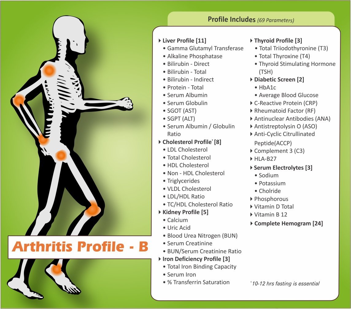 An Arthritis Profile – B test is a blood test panel that helps assess inflammation and identify potential causes of arthritis, including rheumatoid arthritis, by analyzing markers like ESR, CRP, rheumatoid factor (RF), and anti-CCP.